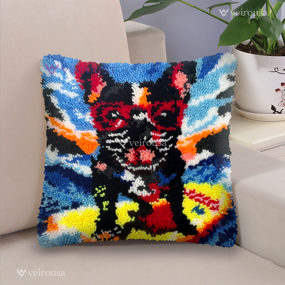 This latch hook kit features a whimsically artistic depiction of a French Bulldog on a surfboard, riding the waves with cool red sunglasses. Set against a vibrant tropical backdrop, this kit promises to add a splash of fun and color to any room with its playful design. Ideal for crafters looking to bring a bit of seaside whimsy into their home decor.