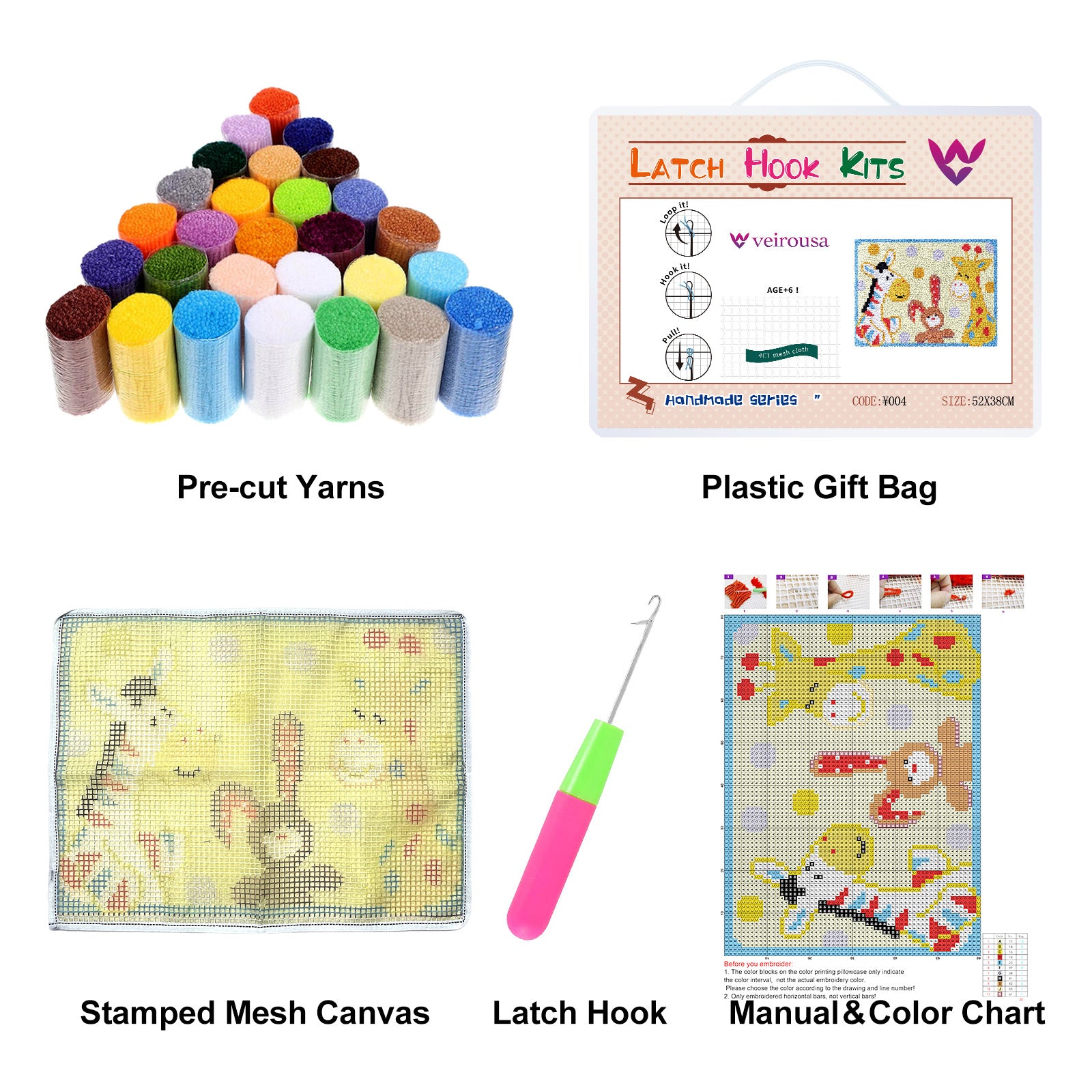 This starter kit includes everything you need to complete a 20x15 in. Rug: